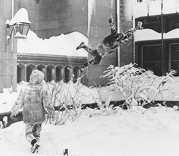 A student jumps into the 23-inch “Great Snow” of 1967. (University of Chicago Photographic Archive)