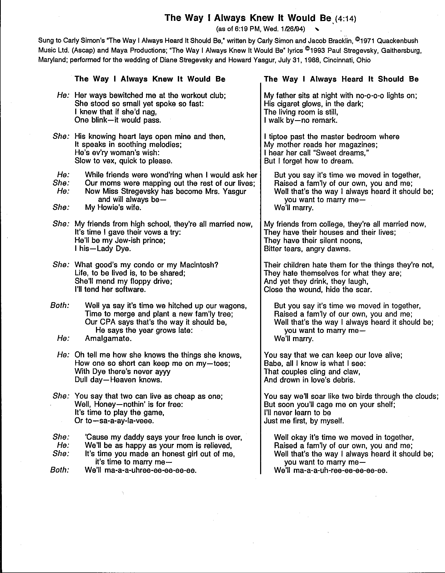 I wrote this for the wedding of my sister, Diane Stregevsky, to Howard Yasgur, on 1988-07-31, in Cincinnati. I performed it with Diane’s friend Mollie Bernstein (later Mollie Kallen). Mollie and I practiced just one time, the day of the wedding.
