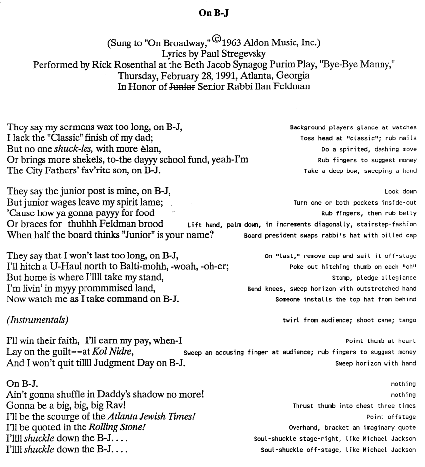BJ stands for Beth Jacob Synagogue in Atlanta, Georgia (USA). I wrote this lyric for BJ’s 1991 Purim play. It was performed by Rick Rosenthal, impersonating our junior rabbi, Ilan Feldman. There was ample choreography by Chani-something. For the musical bridge, Rick danced with a pop-out cane.