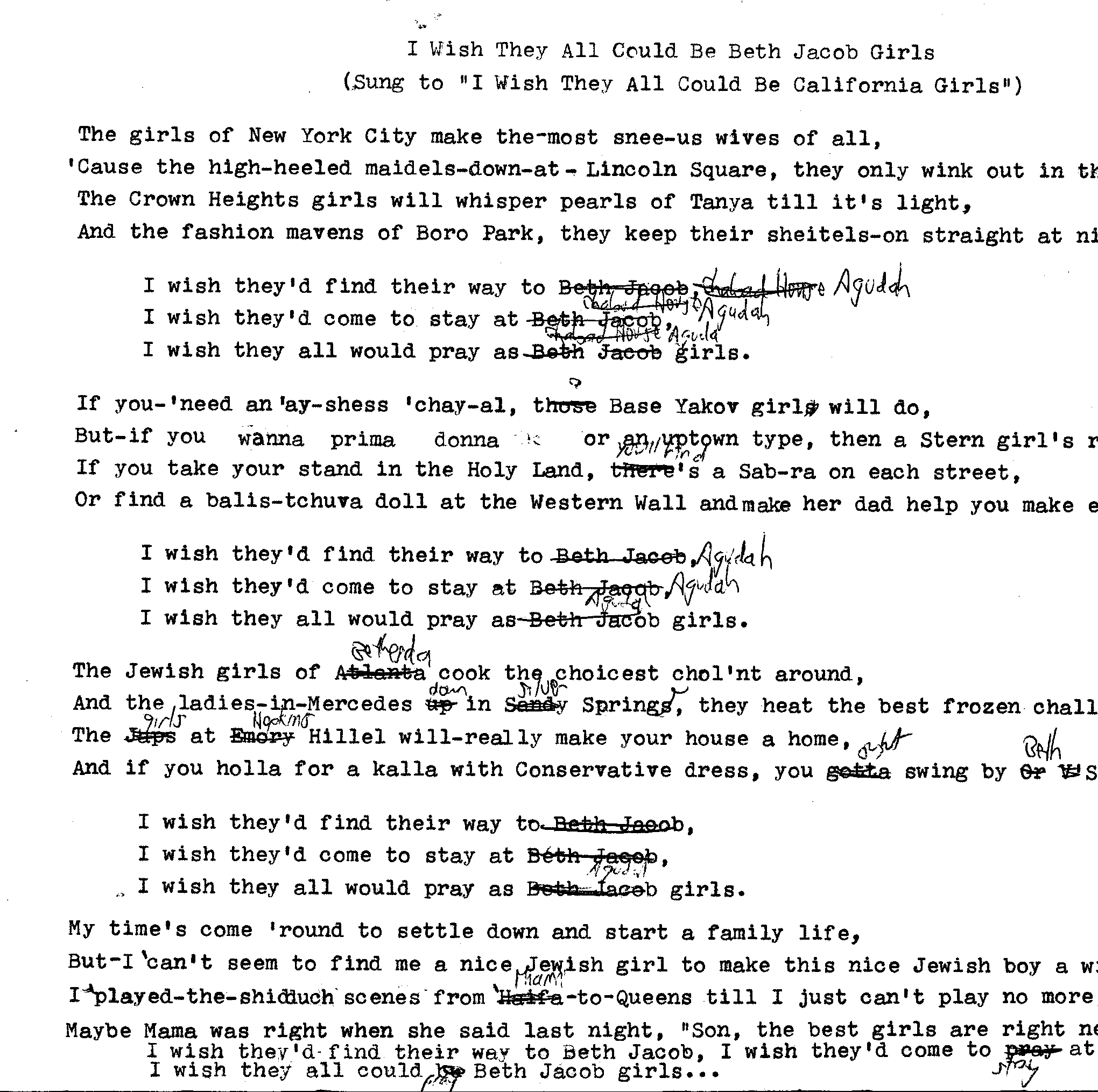 Beth Jacob Girls lyrics, with Paul’s penned changes for Agudah Girls.
