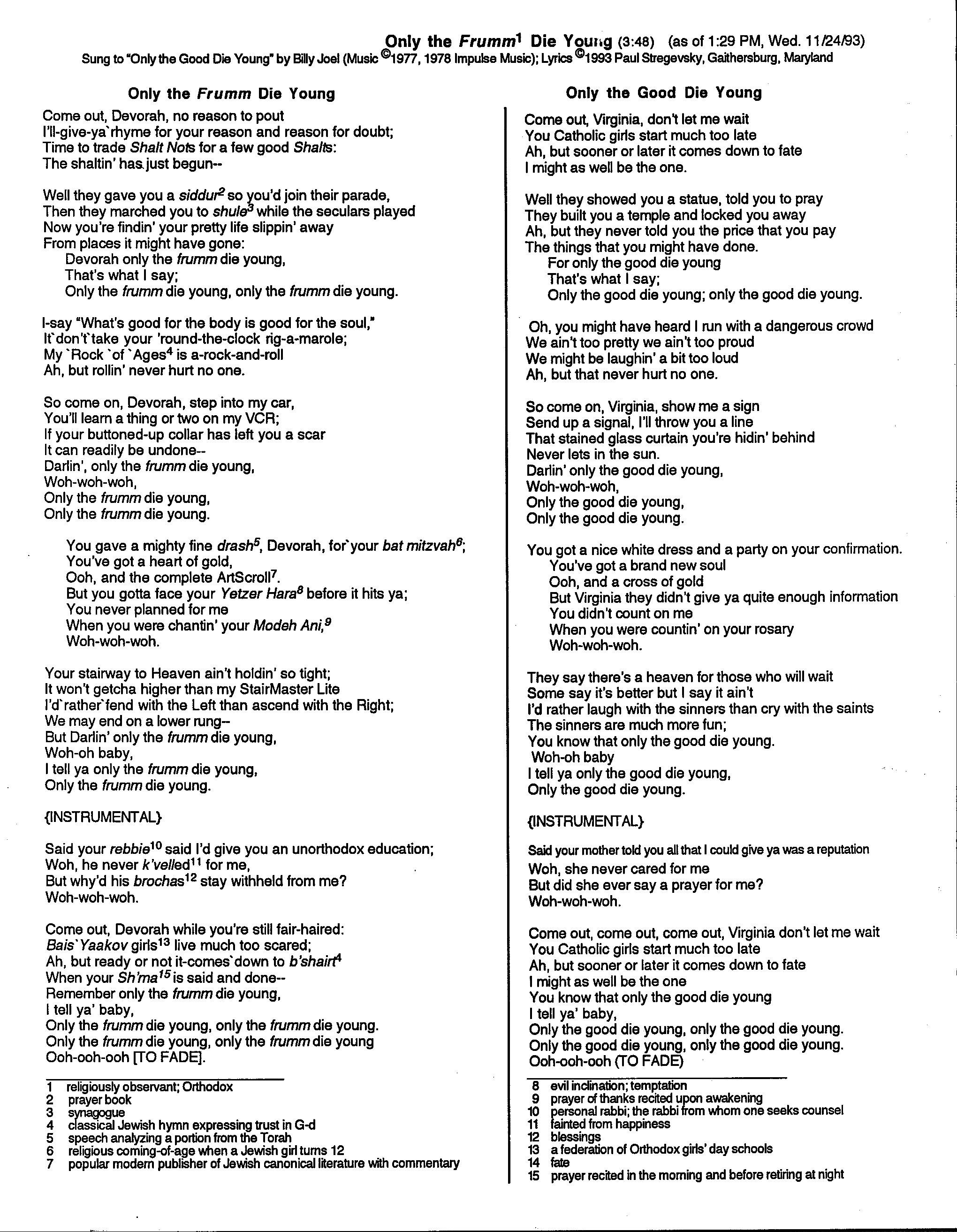 Sung to “Only the Good Die Young” by Billy Joel (1977)