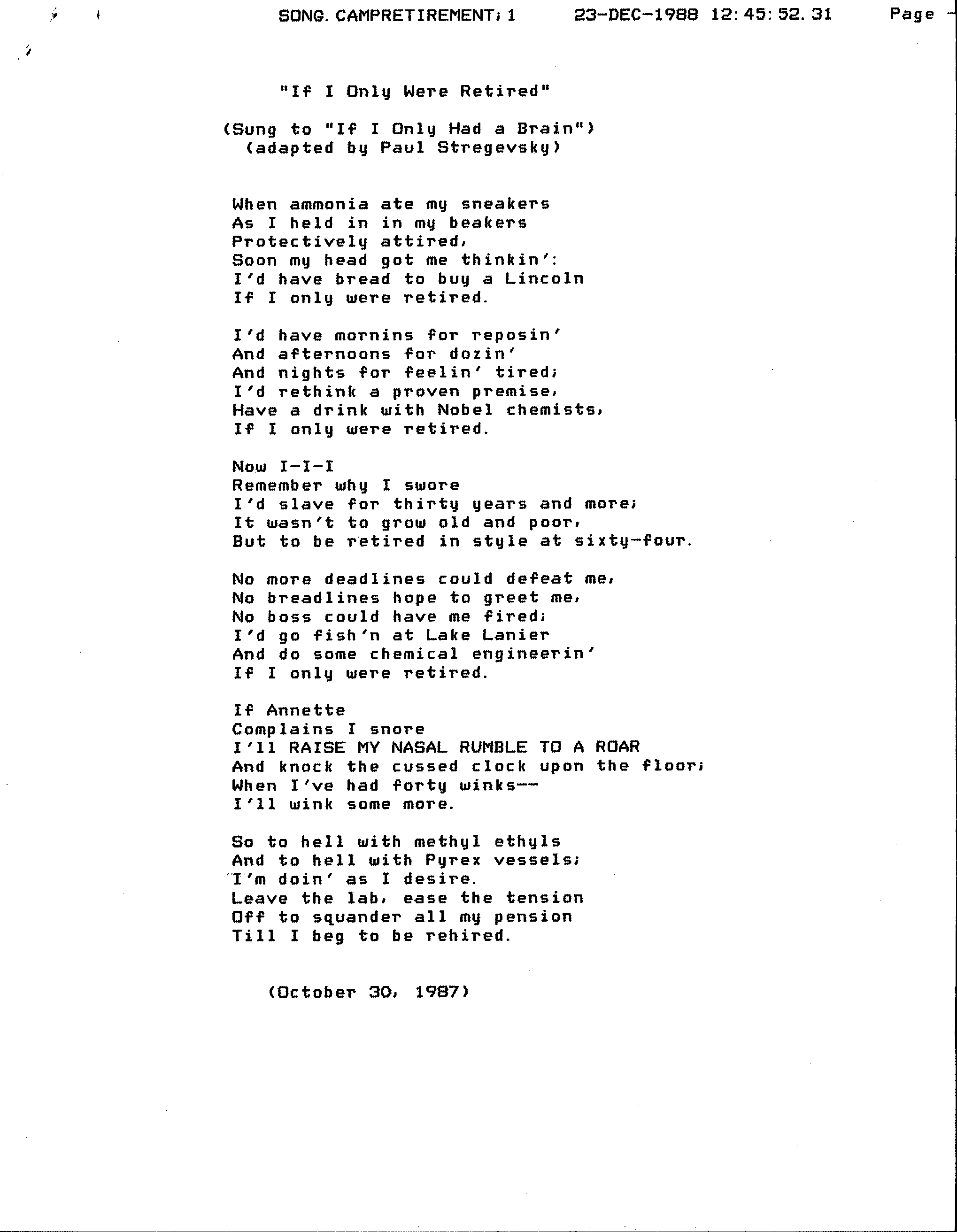 I wrote this for my dad, Sam Stregevsky, upon his retirement from USI Chemicals, Cincinnati, Ohio. I was unable to attend, so I mailed it from Atlanta, Georgia, and my dad sang it at his retirement party.